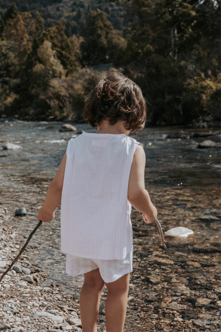 Blusa sin mangas, confeccionada en poplin rayado finito color rosa y blanco. Lleva botones en su parte de adelante que facilitan el uso y ajuste.